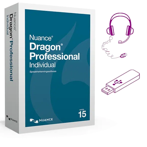 Dragon 15 Professional Individual met USB-headset en software op USB-stick