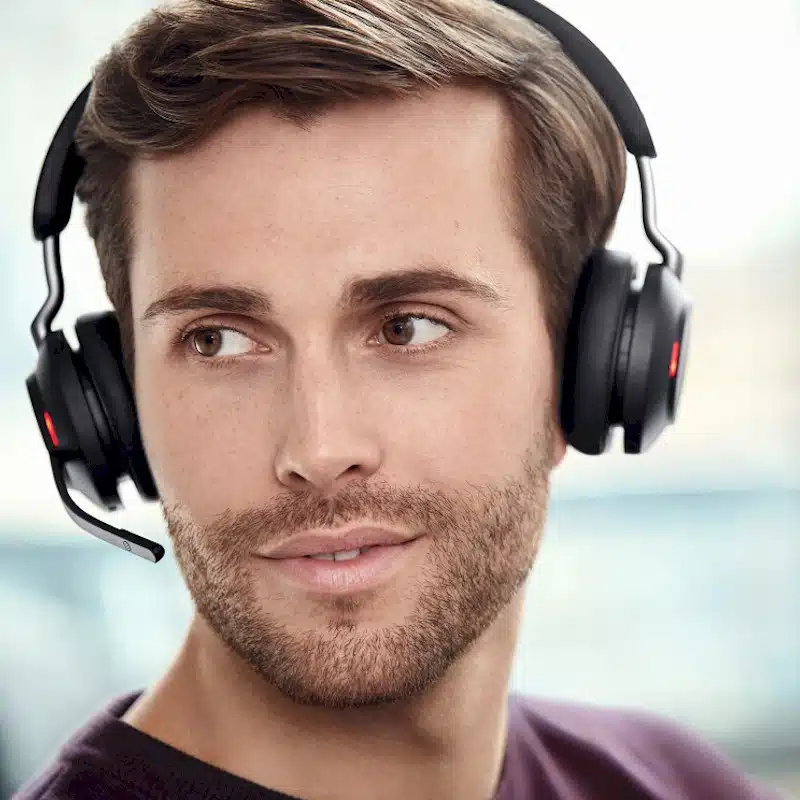 Jabra Evolve2 65 Stereo Bluetooth headset met micro USB-adapter – Plaatje van man die de headset draagt