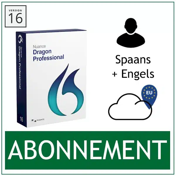 Nuance Dragon Professional 16 Business ABO – De Dragon 16 spraakherkenningssoftware als abonnement. Inclusief upgrades naar nieuwe versies en Cloud opslag van het spraakprofiel – Spaans + Engels dicteren