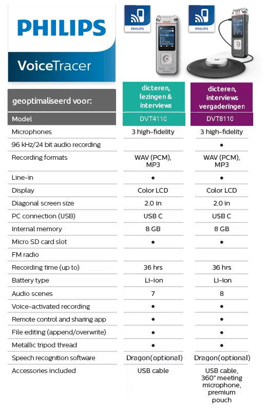 Philips VoiceTracer DVT4110 en DVT8110 digitale dicteerapparaten – Vergelijking van de functies – voor het opnemen van dictaten, lezingen, vergaderingen en interviews – Op voorraad bij AVT