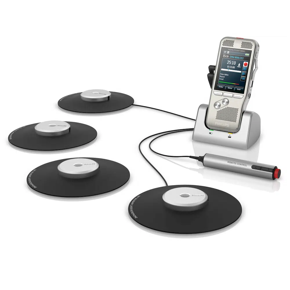 Met de extra microfoons worden de gesprekken van alle deelnemers aan de tafel van dichtbij uitstekend opgenomen. Dit uitbreidbare 360° microfoonsysteem is flexibel en bovendien zeer gebruiksvriendelijk om op te bouwen. Bij een kleine vergadering gebruikt u misschien maar één of twee microfoons en bij een grotere vergadering tot wel 20 á 25 personen legt u vier microfoons op tafel.