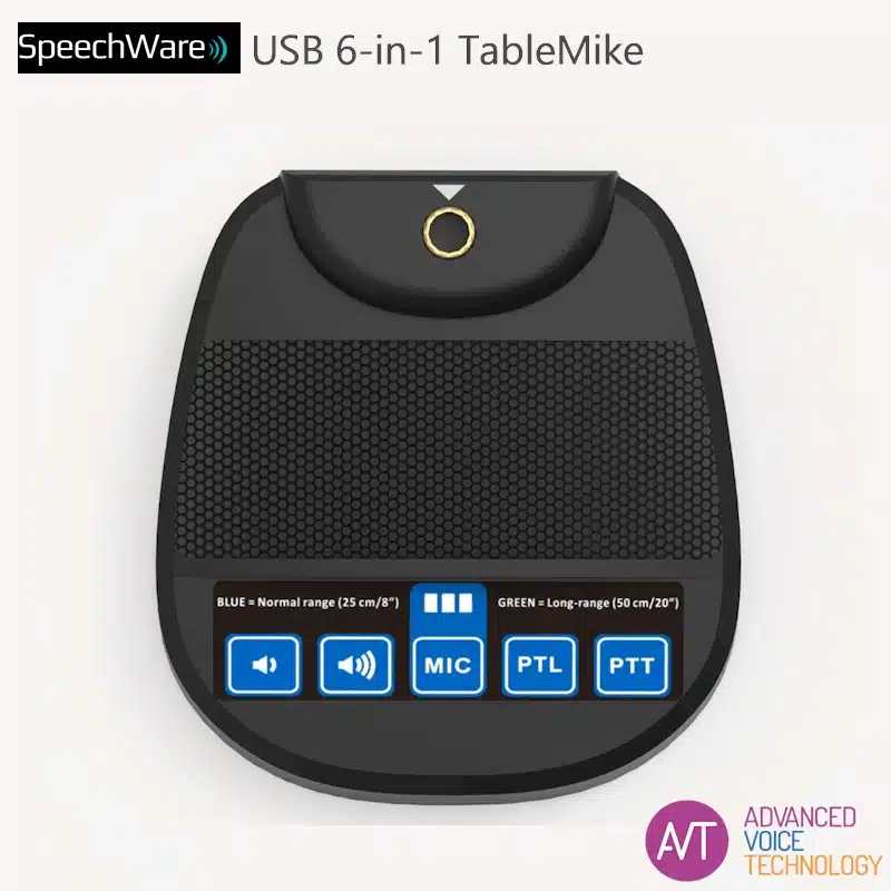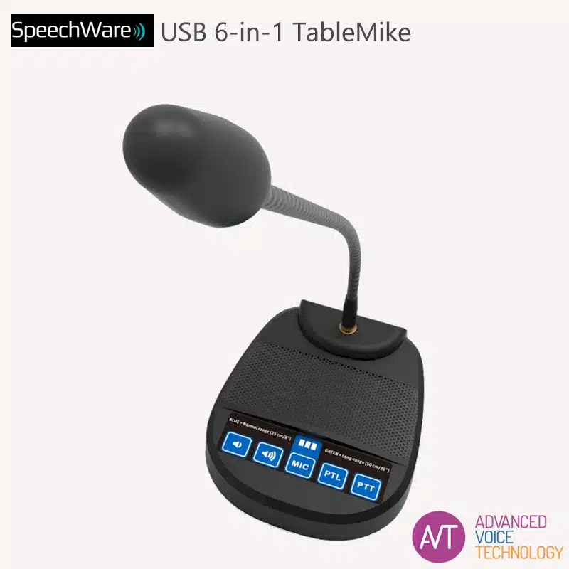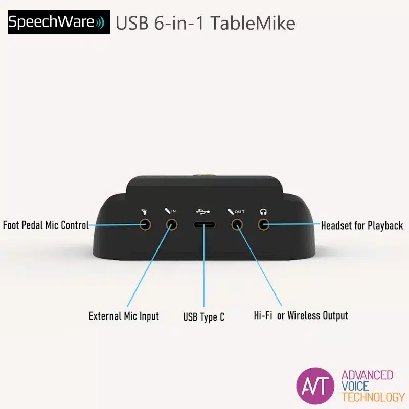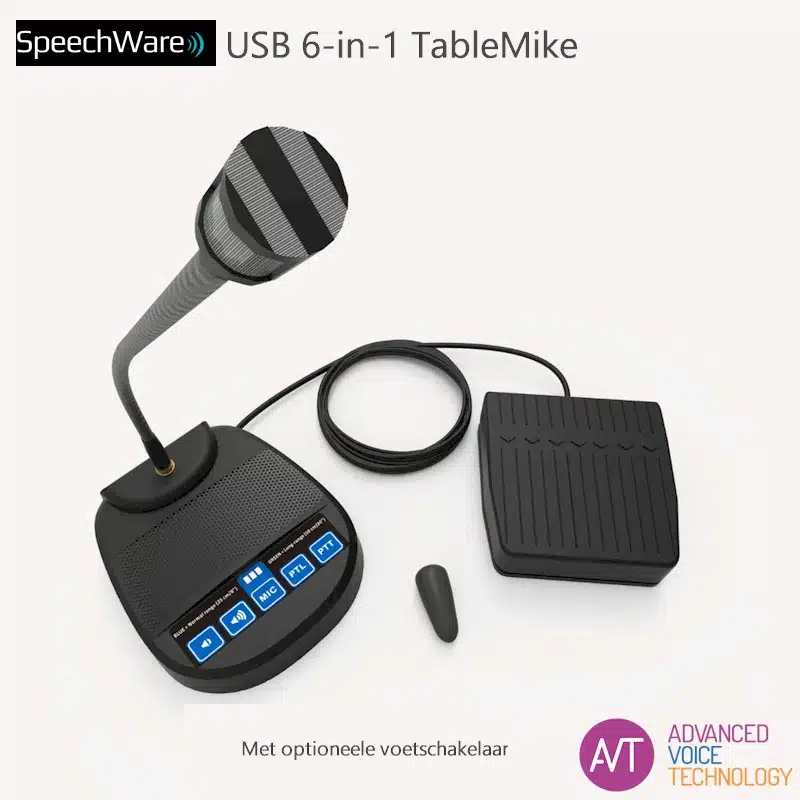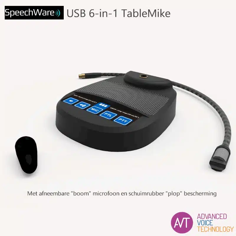 De 6-in-1 USB TableMike van Speechware met ingebouwde geluidskaart, maakt het mogelijk om te dicteren zonder dat u een headset hoeft te dragen. Deze tafelmicrofoon is momenteel de meest accurate op de markt.