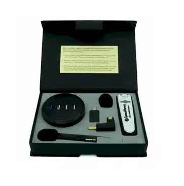 De TravelMike + Base is een combinatie van de TabletMike microfoon en de SpeechWare Multi-adapter en een USB-Hub/standaard. De Multi-adapter is het brein die de achtergrondgeluidfiltering verzorgt wanneer de speciale microfoon geluid opvangt dat uit een andere richting komt dan uit de richting van de spreker.